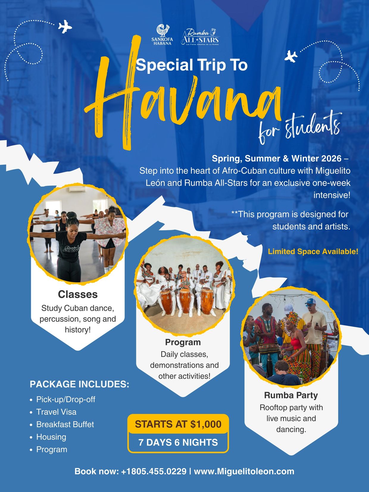 Participants will gain a deeper understanding of the historical and cultural context of Afro-Cuban music and movement through interactive classes, live performances, and exclusive artist demonstrations. The program includes housing, visa support, daily breakfast buffet, full workshop itinerary, and airport transfers.